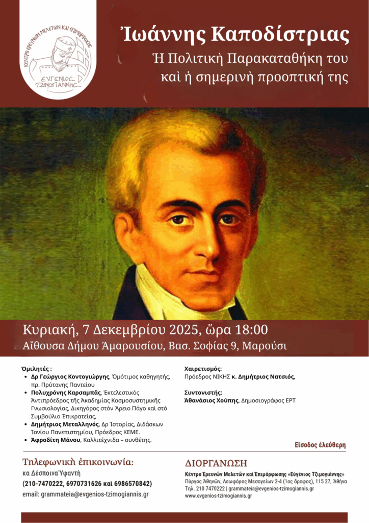 Το Κέντρο Ερευνών, Μελετών και Επιμόρφωσης (Κ.Ε.Μ.Ε), «Ευγένιος Τζιμογιάννης», επιστημονικός – ερευνητικός φορέας του Δημοκρατικού, Πατριωτικού, Λαϊκού Κινήματος ΝΙΚΗ, αξιολογώντας τις ιδιαίτερες συνθήκες που διαμορφώθηκαν τα τελευταία χρόνια στην Ελλάδα και στην Ευρώπη, διοργανώνει Ημερίδα, με θέμα: «Ιωάννης Καποδίστριας: Η Πολιτική Παρακαταθήκη του και η σημερινή προοπτική της». Υπογραμμίζοντας εμπράκτως τη σταθερή πεποίθηση του Κ.Ε.Μ.Ε «Ευγένιος Τζιμογιάννης» και του Κινήματος ΝΙΚΗ, ότι τα σύγχρονα αδιέξοδα ενώπιον των οποίων βρίσκονται η πατρίδα μας και η γηραιά ήπειρος, στο σύνολό της, απαιτούν την επιστροφή στην οπτική, στις πολιτικές και στο παράδειγμα του πρώτου Κυβερνήτη της Ελλάδας Ιωάννη Καποδίστρια.