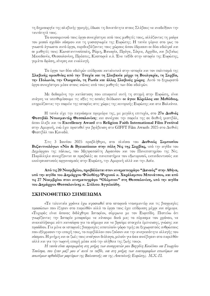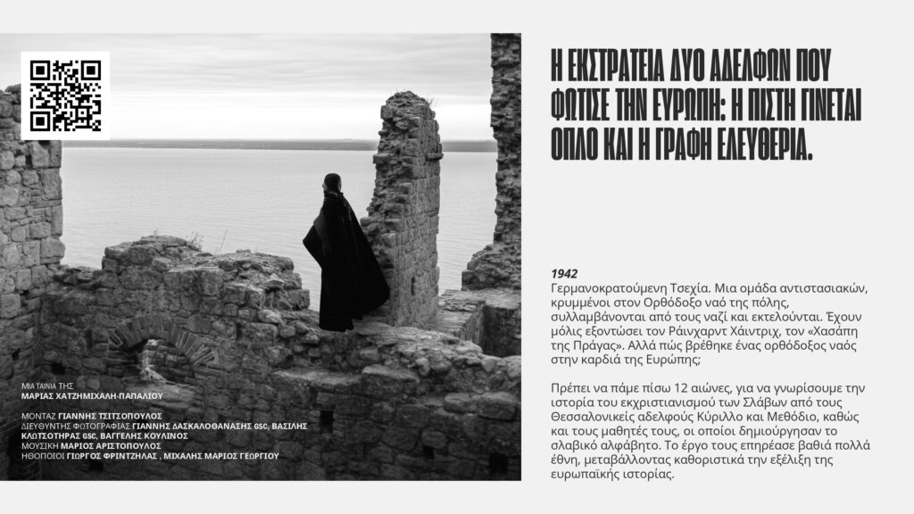 Το νέο δραματοποιημένο ντοκιμαντέρ της Μαρίας Χατζημιχάλη-Παπαλιού έχει στο επίκεντρο τη συναρπαστική ζωή των δύο αγίων αδελφών από τη Θεσσαλονίκη που το έργο τους, με τη δημιουργία της Σλαβικής γραφής, άλλαξε την πορεία της ευρωπαϊκής ιστορίας.