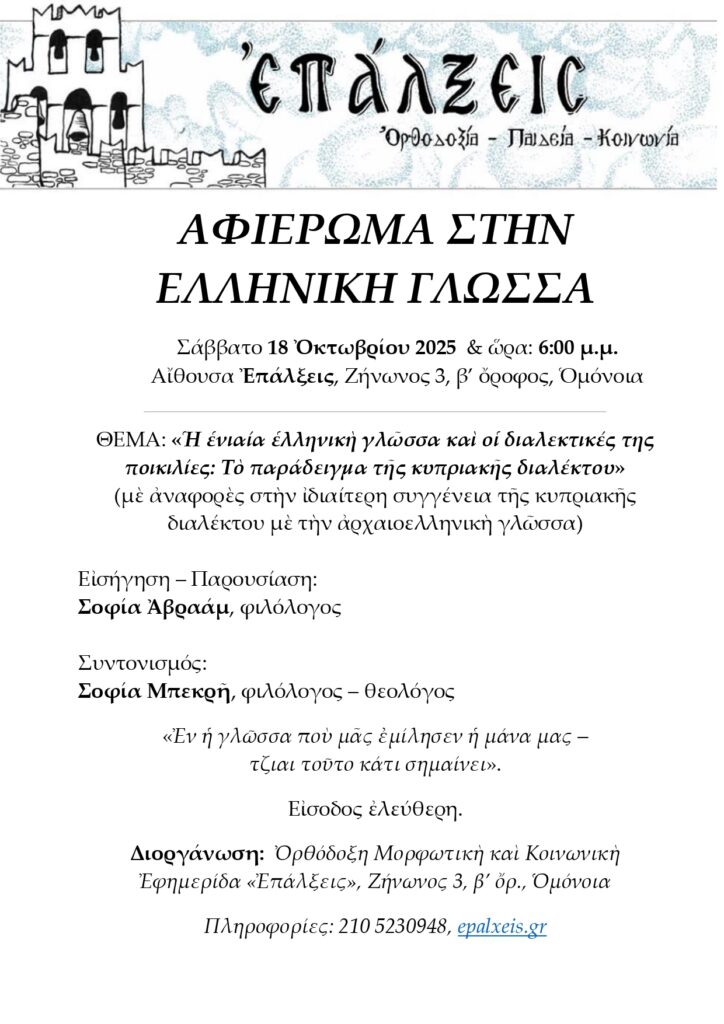 Μὲ τὴν εὐκαιρία τῆς ἑορτῆς τοῦ Ἀποστόλου καὶ Εὐαγγελιστοῦ Λουκᾶ τοῦ Ἕλληνος, διοργανώνεται,τὸ Σάββατο, 18 Ὀκτωβρίου 2025, καὶ ὥρα 6:00μ.μ., στὴν κεντρικὴ αἴθουσα τῶν Ἐπάλξεων, Ζήνωνος 3, β’ ὄρ., Ὁμόνοια, ἐκδήλωση – ἀφιέρωμα στὴν ἑλληνικὴ γλῶσσα, μὲ θέμα: